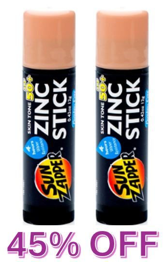 45% off for a twin pack of Light Skin Tone Zinc Sticks! For a limited time only.